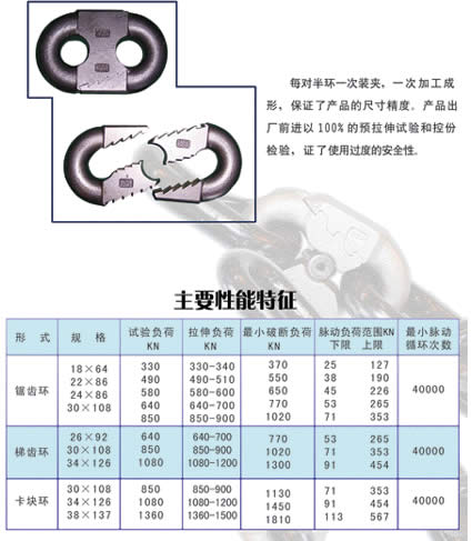 礦用圓環(huán)鏈用開口式連接環(huán)22×86 C 試驗負(fù)荷:415kN。試驗負(fù)荷下最大伸長率:≤2 ;% ;。最小破斷負(fù)荷:≥550kN。破斷后永久伸長率:≥ 8 ;% ;。脈動負(fù)荷范圍(kN):下限38 上限190。最小脈動循環(huán)次數(shù):40000。